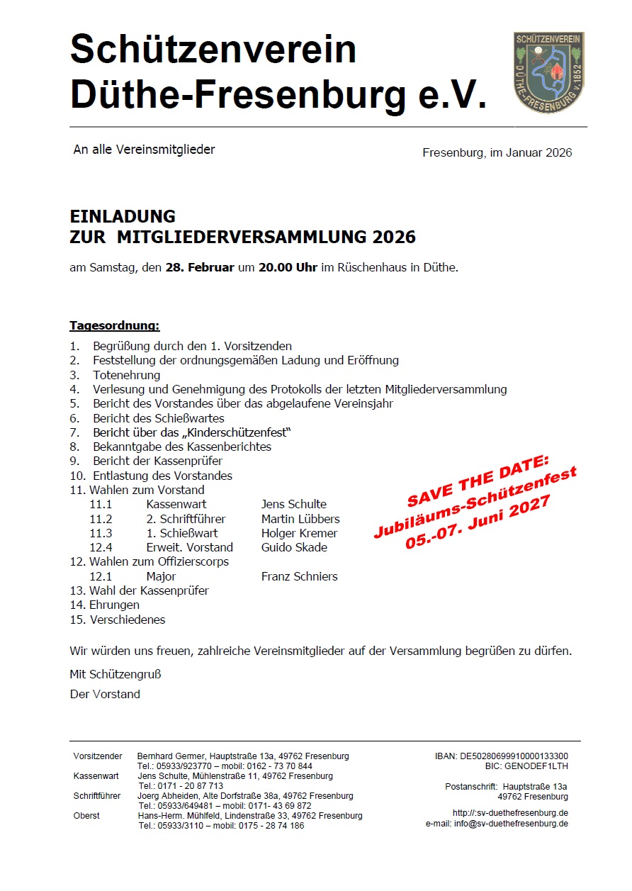 Am 15.02.2025 erfolgte erstmals die Mitgliederversammlung des Schützenvereins Düthe-Fresenburg im Haus Rüschen in Düthe. Der 1. Vorsitzende Bernhard Germer begrüßte gegen 20 Uhr ca. 90 Schützenbrüder- und schwestern sowie den neuen Vereinswirt, die Familie Germer. Neben dem Jahresrückblick des Vereins stellte der Vorsitzende die Vereinsmeister des Vereins in den jeweiligen Altersklassen vor. Tanja Mühlfeld, Mario Führs, Wolfgang Mai und Josef Hartmann wurden ausgezeichnet.
